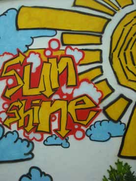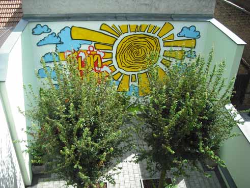 Luca Gruber, 14 Jahre, K ünstler der Juniorenklasse 2 der wfk, hat im Sommer 2010 mit Freude den künstlerischen Auftrag einer Wiesbadener Immobilienfirma in die Tat umgesetzt. Er gestaltete und realisierte in einer Hofeinfahrt unter der beratenden Begleitung der Schulleitung der wfk ein freundliches, aber knalliges Graffiti-Motiv.